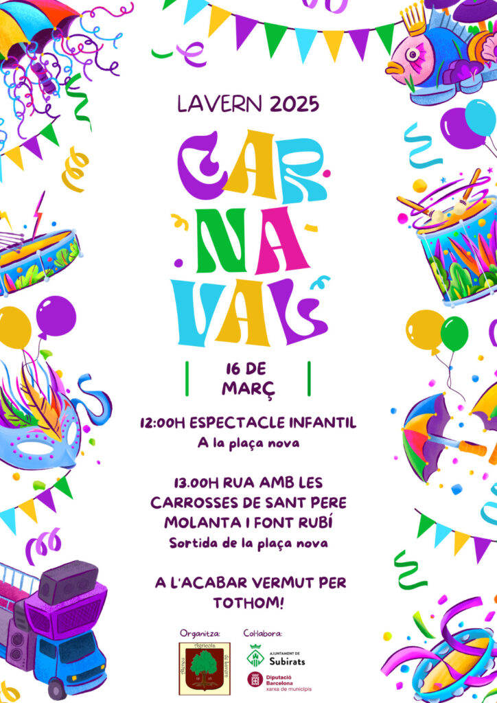 A causa de les obres de millora de la Sala de l’Ateneu, aquest any els actes de carnaval es redueixen a un sol acte el diumenge 16 de març amb un espectacle infantil a la Plaça del Cafè a les 12h i la rua a les 13h.