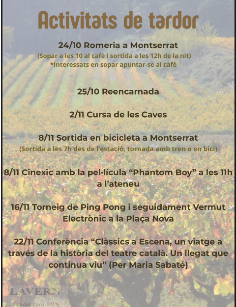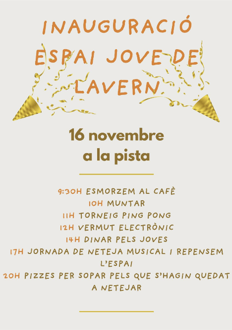 EL diumenge 22 DE NOVEMBRE tenim una jornada plena d’activitats per inaugurar el local dels joves de lavern!! Al matí sou tots convidats per jugar un torneig de ping pong seguit d’un vermut electrònic. Després, pels joves que s’animin, hi ha un dinar (pel qual us heu d’apuntar prèviament) i a la tarda jornada de neteja musical amb pizzes per qui hagi vingut a ajudar.