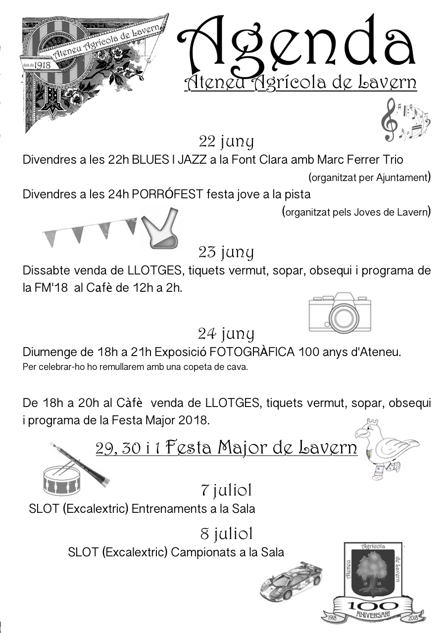 DISSABTE 18 Campionat d’excalèxtric (Slot) 11h Entrenaments 23:30h Cursa de resistència. 12h Festa de la Coral de Lavern (A les escoles) i PORRÓFEST a les 23h (Concert jove a l’envelat amb Timón Repúblic, Fora de to i Tropical Riots)