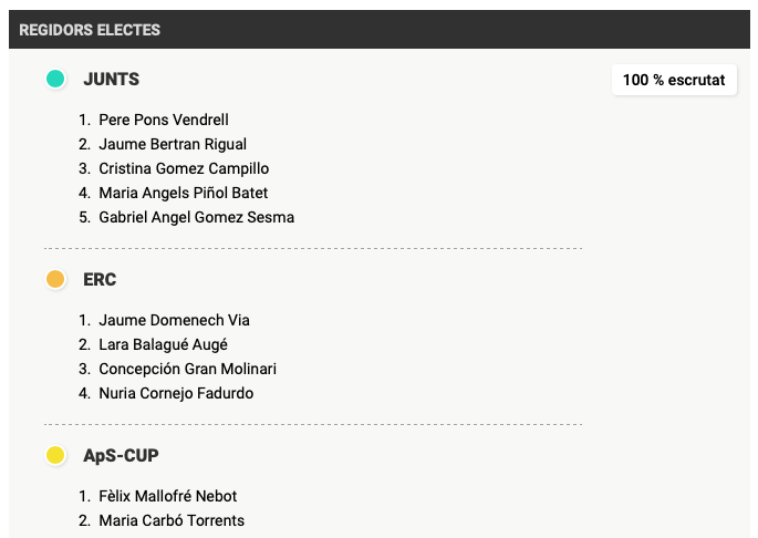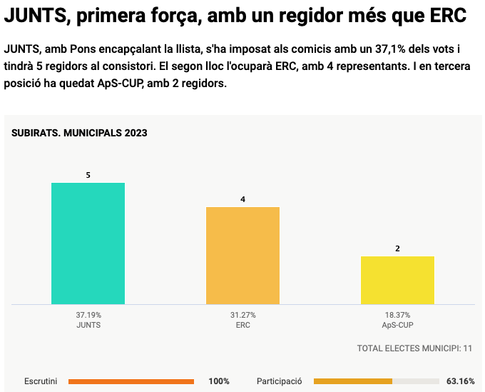 Observant els resultats de Subirats, veiem que Junts pot gobernar en minoria, o fer coalició amb alguna de les altres dues forces. Al mateix temps un pacte entre ERC + CUP pot prendre l’alcaldia al Sr. Pere Pons, després de tres mandats consecutius. Queden fora del consistori dos partits, el PP i el PSC, aquest últim amb l’ex-regidor Santi Fontanet.