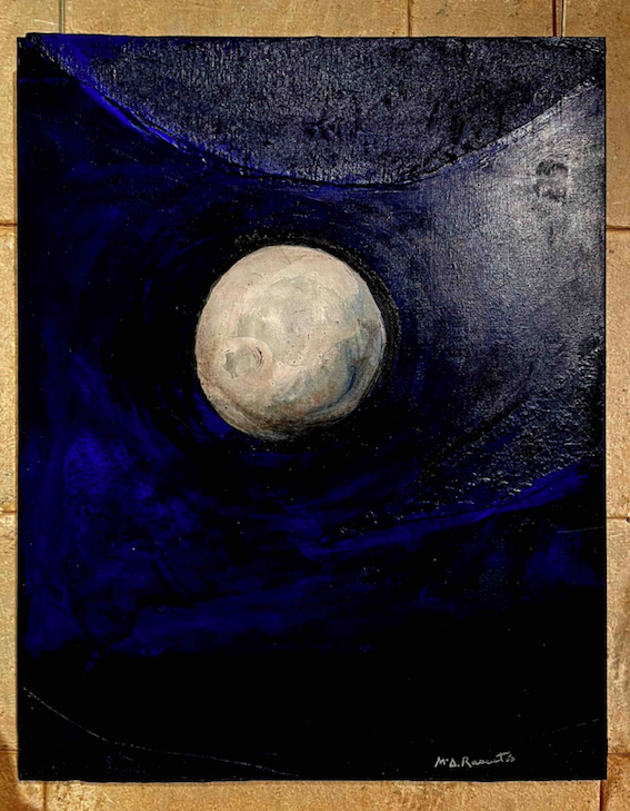 En aquest cas l’artista explora els astres sobre el llenç quadrat i la planxa d’alumini rodona. A l’exposició hi trobareu la lluna, els planetes i nebuloses. En alguns quadres hi domina la força de la llum astral, en altres la llum intensa de l’astre rodó s’embolcalla de la foscor de l’espai, però aconsteu-vos-hi. Cal mirar l’obra d’aprop per trobar-hi un mar de blaus i liles intensos, textures, fibres i fins i tot vidre.