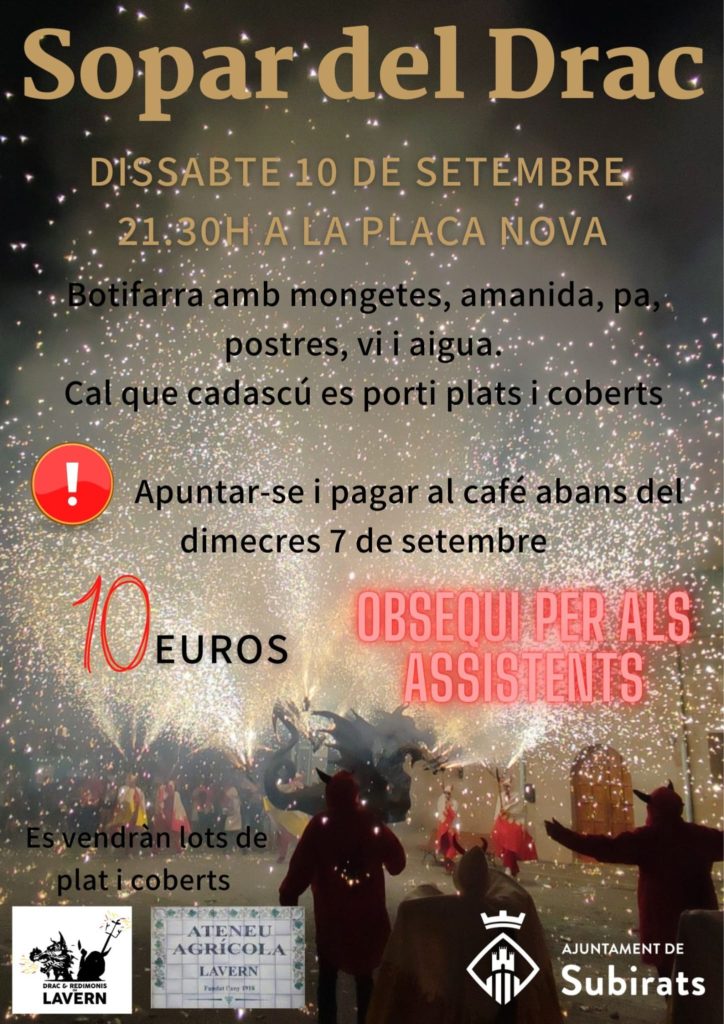 Poble! Per fi podem tornar a dir que el tradicional Sopar Del Drac torna! -Quin dia? -10 de setembre -Quina hora? -21.30 h -On? -Plaça nova del Cafè. -On cal apuntar-se? -Al Cafè de Lavern (cal pagar en el moment de la inscripció). -Ens podem apuntar per grups? -Si, només faltaria! -Que hem de portar? -Plats i coberts (cuidem el medi i estalviem residus, si algun el deixa, en podrà comprar al moment)