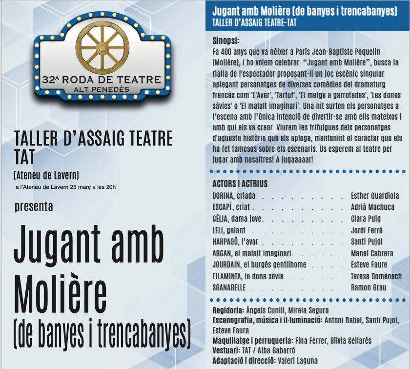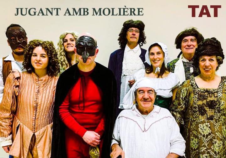 La colla del TAT (Taller d’Assaig i Teatre de Vilafranca) volem celebrar que fa 400 anys va néixer a París Jean-Baptiste Poquelin (Molière). “Jugant amb Molière” busca la rialla de l’espectador proposant-li un joc escènic singular aplegant personatges de diverses comèdies del dramaturg francès com ‘L’Avar’, ‘Tartuf’, ‘El metge a garrotades’, ‘Les dones sàvies’ o ‘El malalt imaginari’.